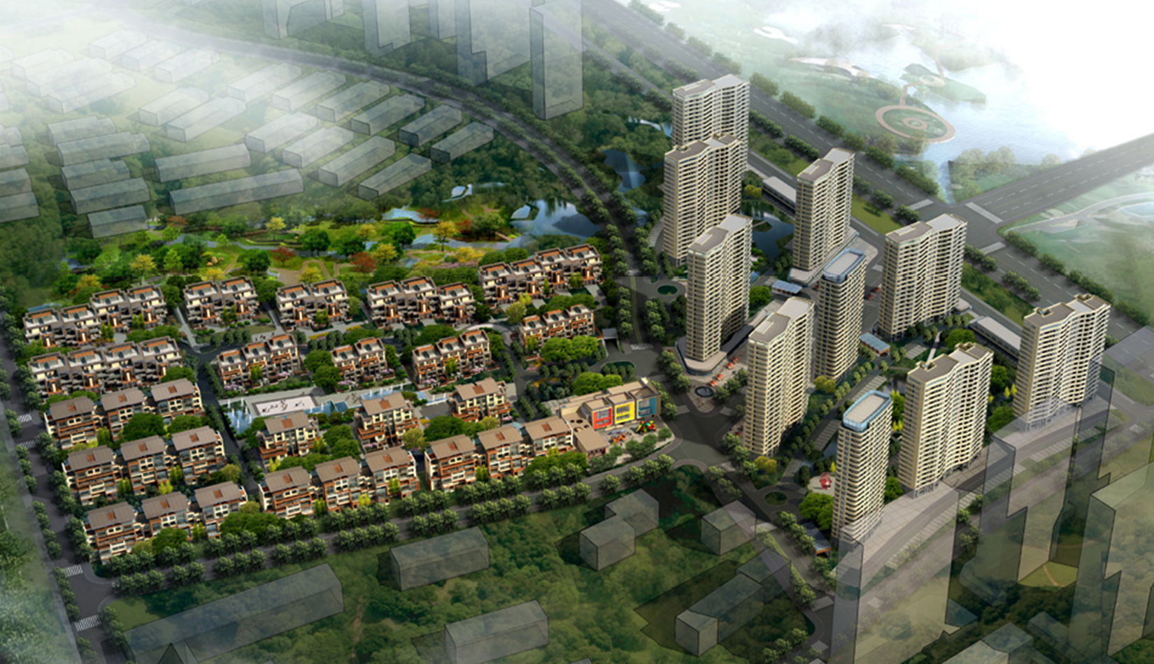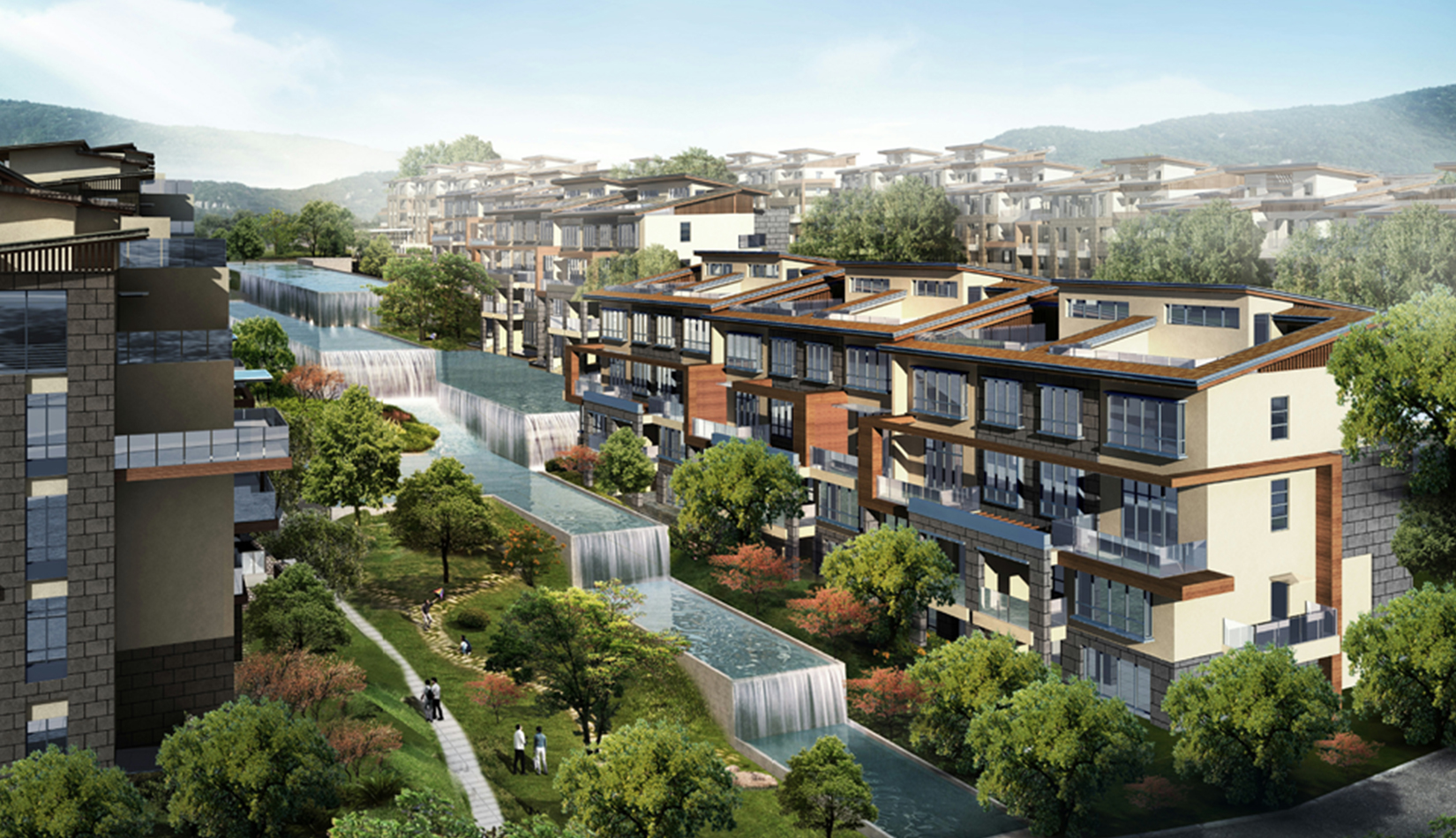 在總體的規(guī)劃設(shè)計中,設(shè)計師的靈感主要來源于項目中現(xiàn)存的分布于場地中央和南北地塊的數(shù)處面積不大但卻別具自然風(fēng)情的水體和山頂雨水沖刷所形成的沖溝。