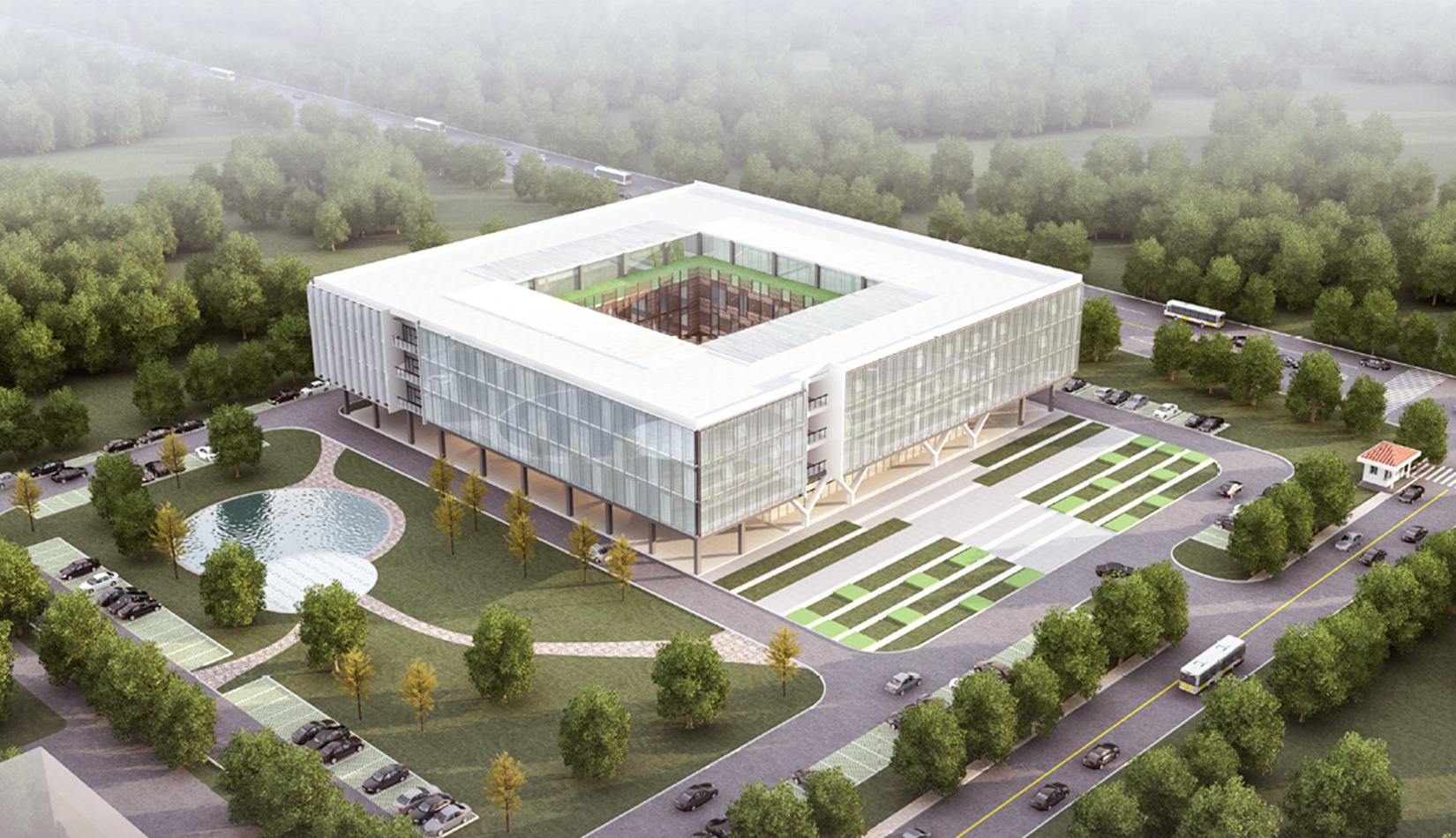 項目以辦公空間的合理性、實用性、靈活性作為設(shè)計點(diǎn),運(yùn)用綠廊、簡約立面等手法將企業(yè)文化與生態(tài)辦公理念相融合,同時充分考慮和拓展設(shè)計中的可能性,從而營造出怡人的辦公空間和景觀環(huán)境。