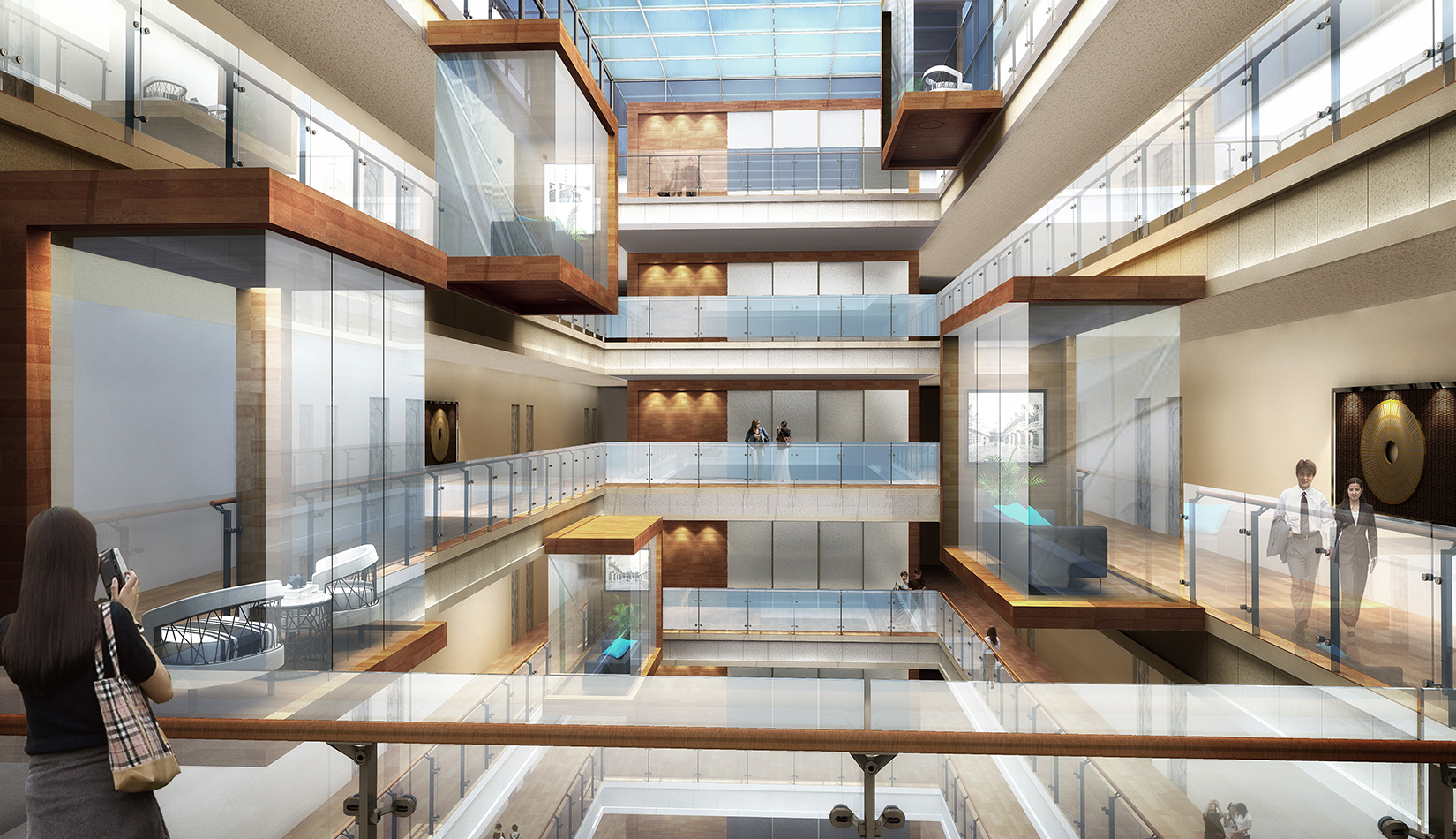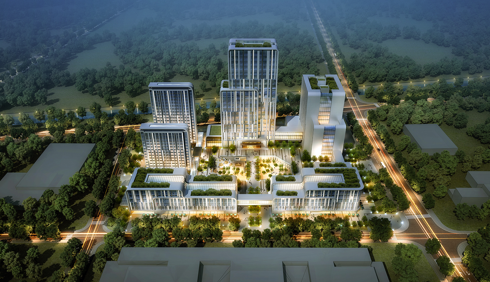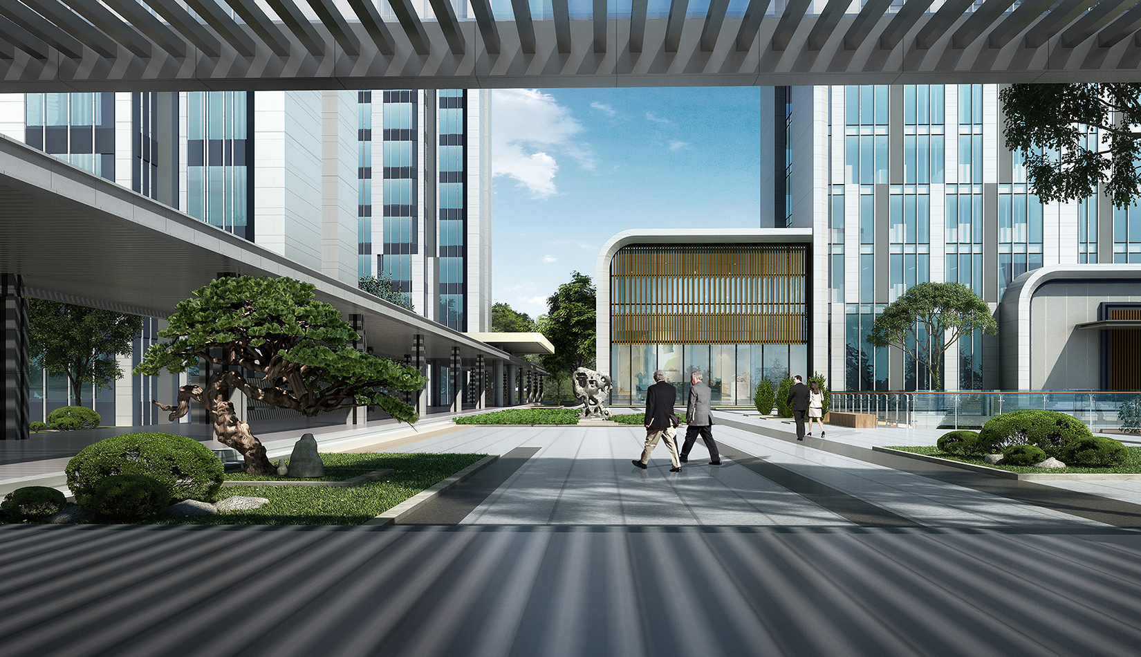 建筑圍合共享的中間庭院,庭院采用新中式風格,屋頂設(shè)計屋頂花園,靜謐淡雅,為人們提供一個安靜休憩空間。