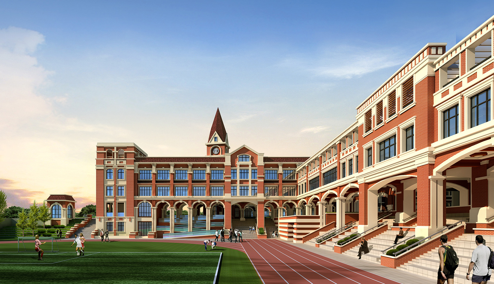 校園建筑風(fēng)格采用簡(jiǎn)約歐式風(fēng)格,以明亮、歡快的紅磚作為校園主體色調(diào),通過淺色石材、線腳的穿插勾勒建筑輪廓,形成極具特色的歐式花園式校園。