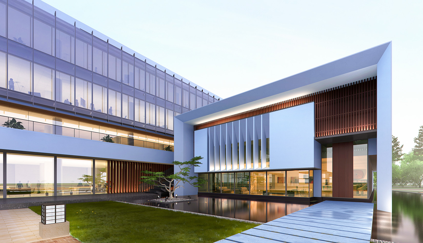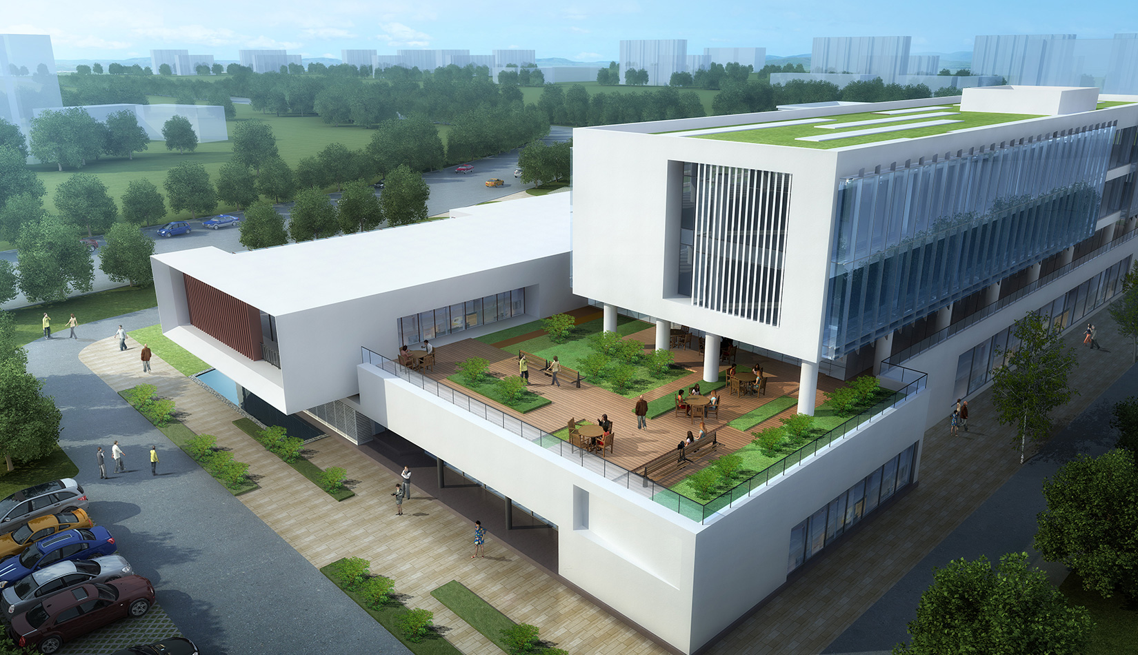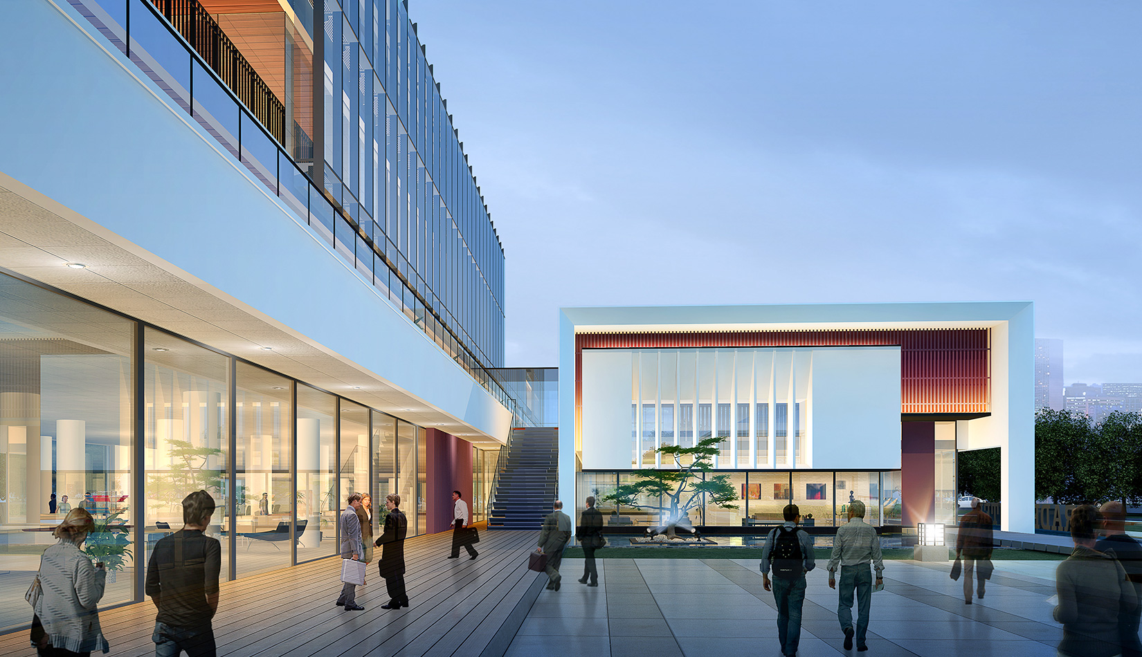 作為中韓貿(mào)易合作區(qū)一期啟動區(qū)的重點項目,其承擔(dān)著對外展示以及為后續(xù)發(fā)展提供服務(wù)平臺的功能。因此設(shè)計力求穩(wěn)重大氣,以4 層的體量打造出地標(biāo)性的建筑。設(shè)計運用簡潔的外形、寧靜的色彩,外立面以白色涂料和木格柵為主,尊重自然,打造一種平和寧靜的感覺。在空間設(shè)計上通過共享空間、上人露臺和一層大平臺,創(chuàng)造出舒適宜人的工作環(huán)境;在技術(shù)上通過地源熱泵、呼吸式幕墻、雨水收集等的應(yīng)用,實現(xiàn)建筑的綠色節(jié)能環(huán)保。
